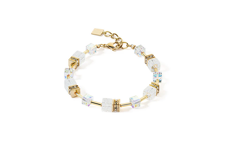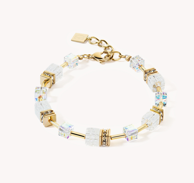 Celebrating the beauty of nature. Mysterious rock crystal takes centre stage with this bracelet from the iconic GeoCube® collection. The perfect touch for any outfit. Handmade in Germany with natural  rock crystal, European Crystals, rhinestone rondelles, and gold plated stainless steel.